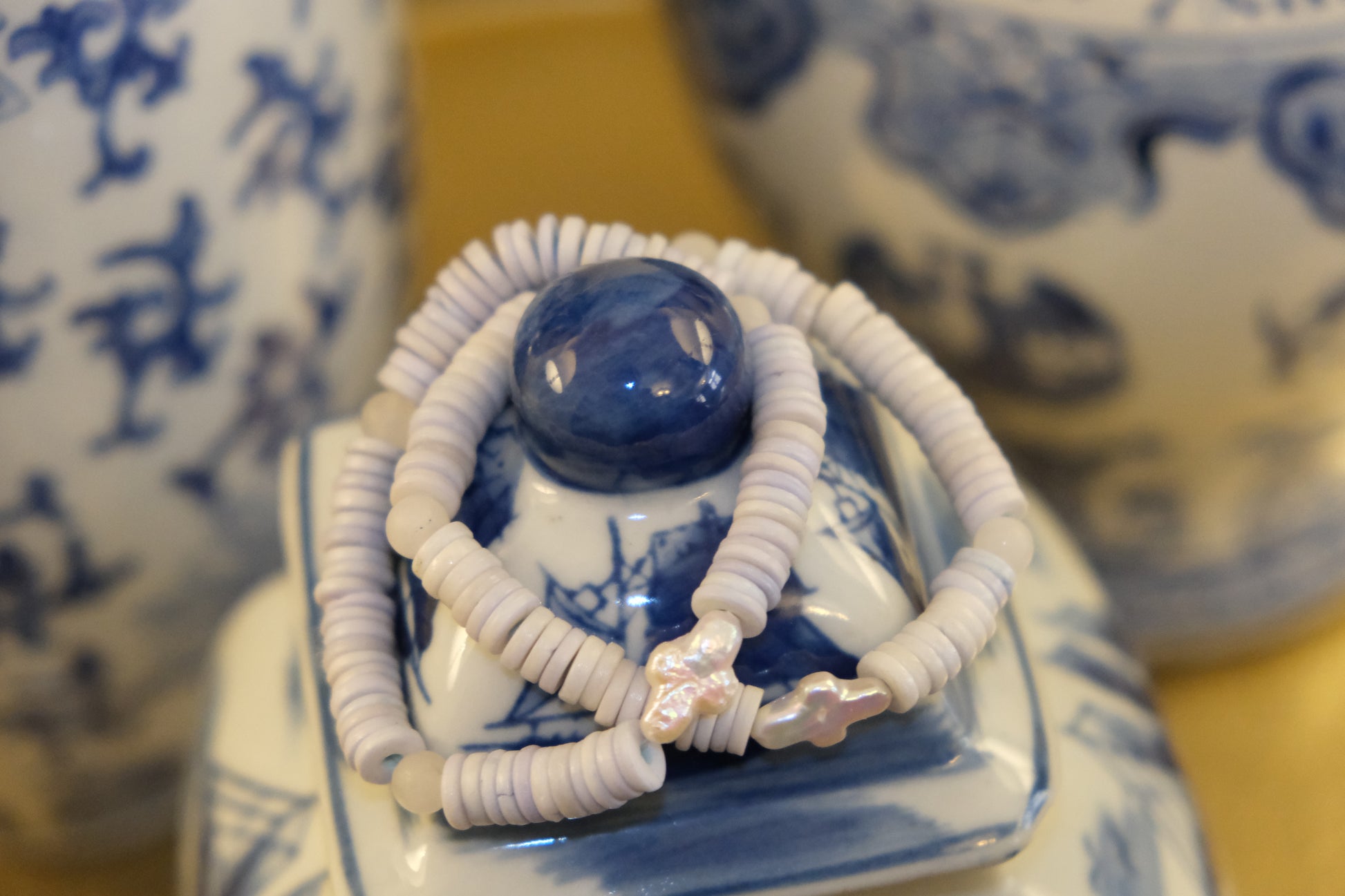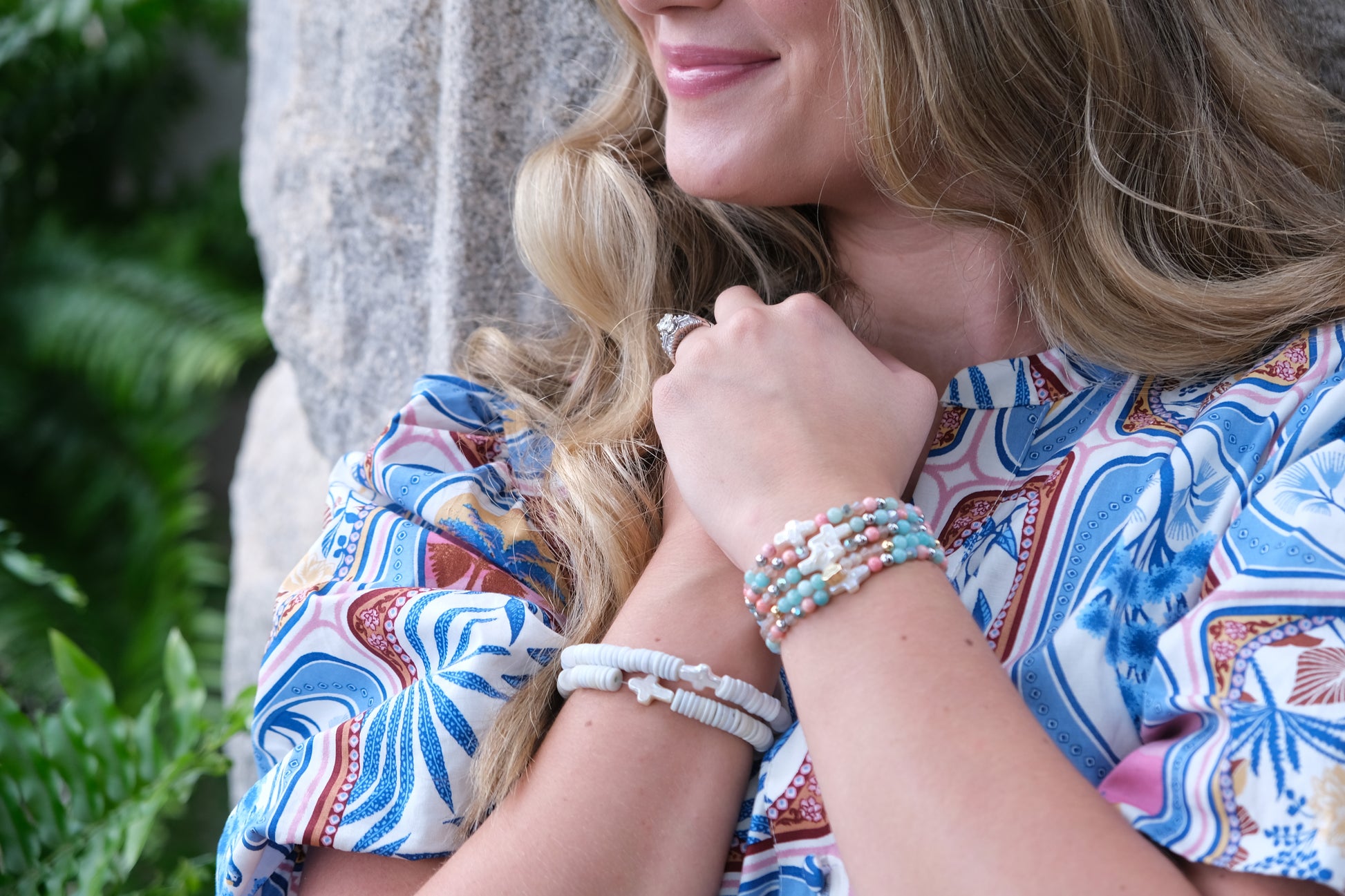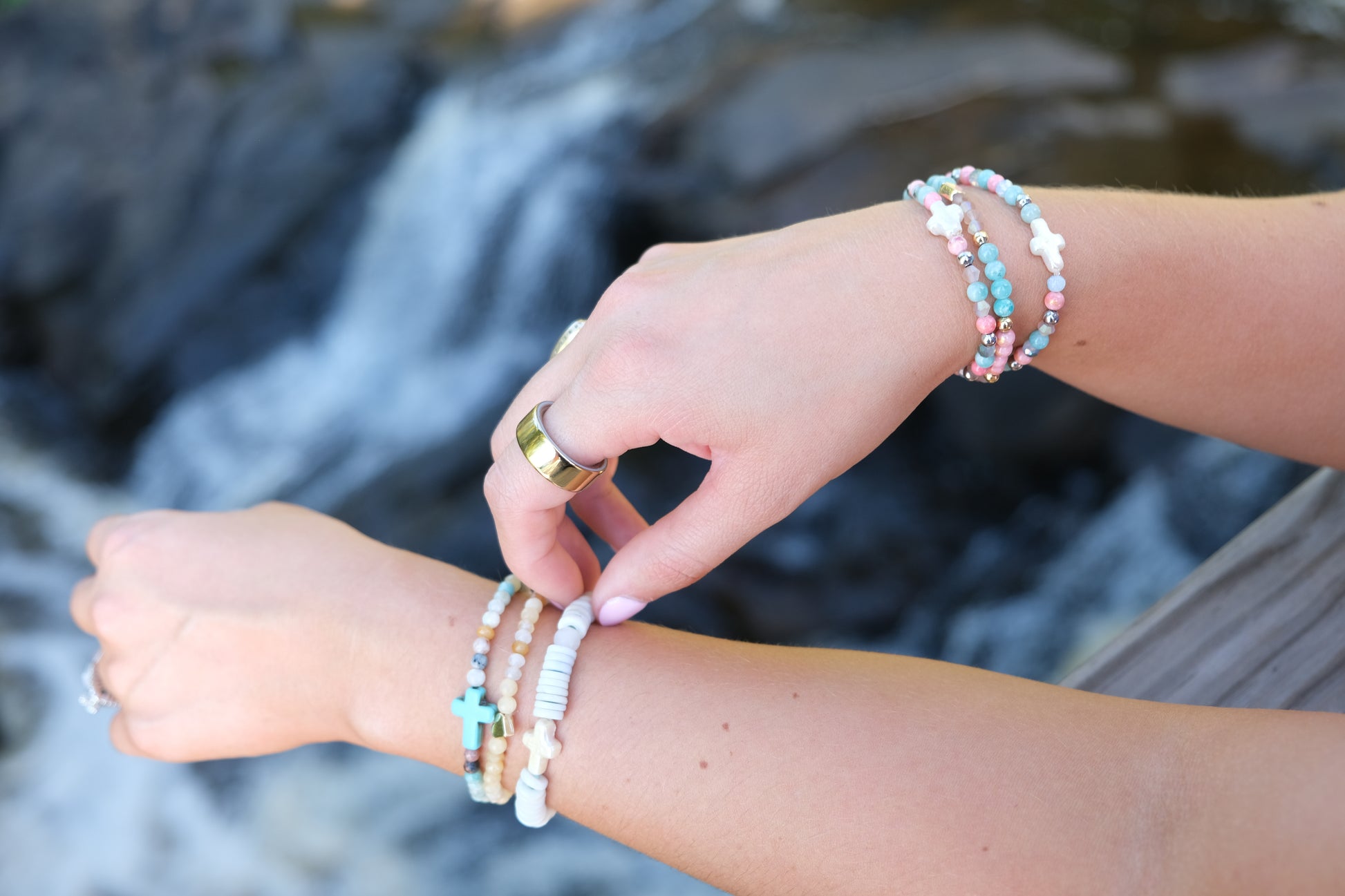 These natural beads are handcrafted by artisans in the Nepal countryside using recycled materials, making each bracelet not only beautiful but also a reflection of restoration and purpose. The light blue shell beads reflect the calm of ocean waters, the soft tones symbolize serenity, and the delicate cross reminds us of the promise of heaven. Each bead tells a story of grace, reminding us that His voice brings clarity, hope, and peace to the heart.